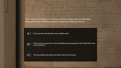 However, this is absolutely is deliberate, as you’ll discover in the game itself, although it’s arguably not conveyed anywhere near as well as it really needs to be. This split mindscape is best exemplified by sections where you’re given the chance to make choices, opting from a few different lines of text that in essence boil down to siding more with how the hospital saw things and whether they really were just doing their best to treat a difficult patient, or Renee herself, choosing to believe that she didn’t need to be there, that she was ripped from a life simply because she didn’t yet know her place. The hospital, after all, had good people too, and the doctors were mostly just doing the best they could for that period in time. Of course the fact that you play as Renee and view the many things she went through from her perspective skews the game, making it unlikely most players would bother siding with the hospital. Still, different choices affect the branching storyline, so there is a reason to go back through and try choosing some opposite answers.